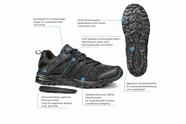 Die Halbschuhe MAGNUM Storm Trail Lite überzeugen durch ihre vielseitige Einsetzbarkeit und ihr besonders geringes Gewicht. Das atmungsaktive und schnelltrocknende Innenfutter sorgt für ein angenehmes Fuß Klima, auch bei intensiver Nutzung. Der gepolsterte Schaftbereich sowie die weich gefütterte Zunge erhöhen den Tragekomfort deutlich. Die herausnehmbare Innensohle ermöglicht eine individuelle Anpassung oder den Einsatz eigener Einlagen. Für optimale Dämpfung und Entlastung der Gelenke sorgt die CMEVA-Zwischensohle, während die rutschfeste Gummilaufsohle zuverlässigen Halt auf unterschiedlichen Untergründen bietet. Die 5-Loch-Schnürung gewährleistet einen sicheren Sitz, ergänzt durch eine praktische Anziehlasche für schnelles An- und Ausziehen. Abriebfeste PU-Verstärkungen sorgen für zusätzlichen Halt und Schutz