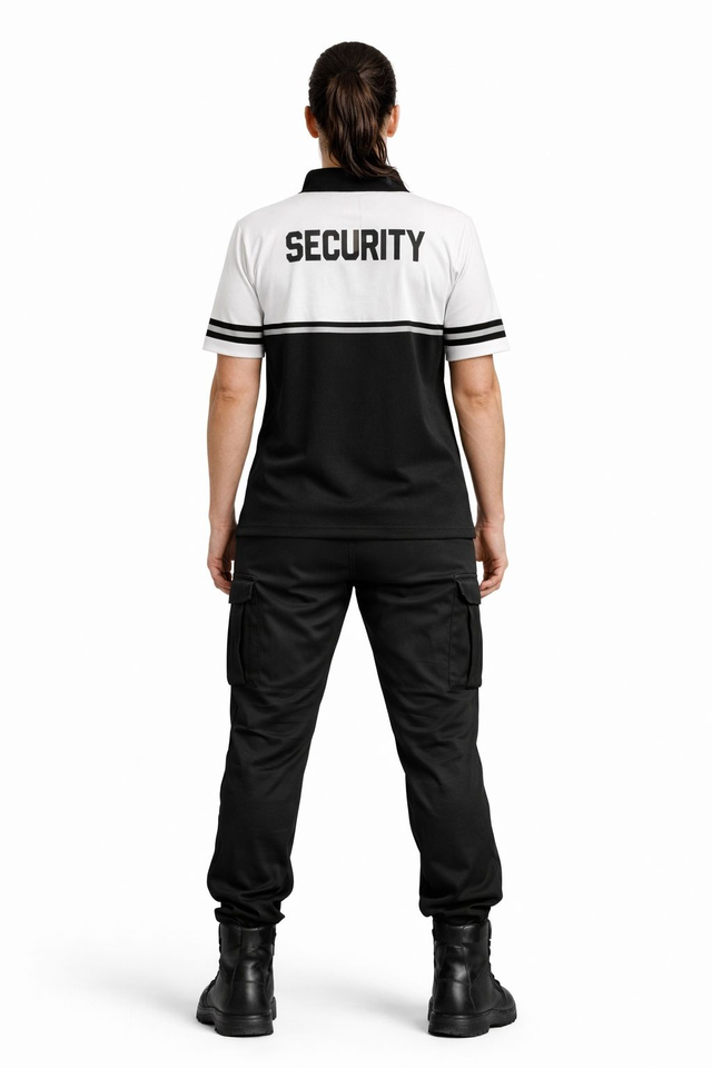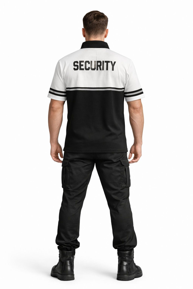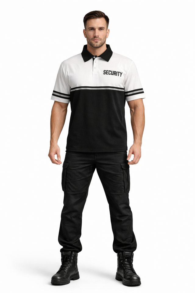 Designer-Sicherheits-Polo Weiß mit Reflektorstreifen für maximale Sichtbarkeit. Das weiße Shirt trägt den Schriftzug „SECURITY“ auf der Vorder- und Rückseite sowie einen schwarzen Kragen. Reflektierende Elemente erhöhen die Sicherheit bei Nacht. Atmungsaktives Material 100% Baumwolle macht das T-Shirt zum idealen Begleiter für Sicherheitskräfte, Wachpersonal und Ordnungsdienste.